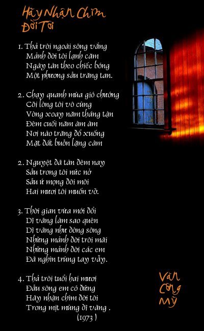 Bài thơ của VCM được một người bạn phổ nhạc và đem về tặng lại cho tác giả. Tình cờ và cố ý cố tình được đọc trước bài thơ, thấy bài thơ cũ mà tác giả lại cố ém không gởi cho trang nào, mới thấy chuyện hơi lạ? Thấy lạ nên phải hỏi. Hỏi thành sinh ra cái bài phỏng vấn bỏ túi này. Nay chép lại và viết vài dòng trước mua vui cho tác giả, sau làm việc nghĩa giới thiệu với mọi người.