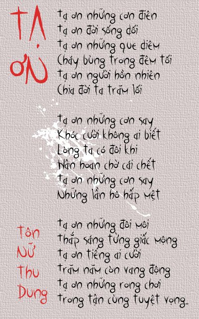 2. Bài thơ buồn tê buốt, phát sóng…nhói những cơn đau “tận cùng tuyệt vọng”-va chạm tím tái- để rồi “từ tạ”, để rồi…dội lại chút “yêu thương” còn hơi nóng sót trong đống tro tàn cuộc đời giá băng, để rồi sưởi-soi ấm lòng phải …”Tạ Ơn”, mà vui sống với đời, chị Thu Dung ơi!
