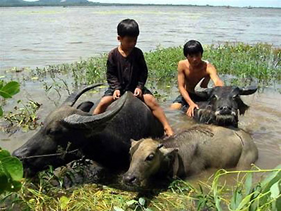 Đàn trâu đã bắt đầu lội nước, Long ngồi trên lưng con Chãng, nó lội đi phăng phăng . Nắm đuôi con trâu mẹ nó kéo tôi đi một hồi, rồi tôi đưa bàn tay vuốt nhè nhẹ lên lưng và thì thầm như ngầm muốn nói với nó cho tôi leo lên lưng. Xong tôi leo lên lưng nó. Mới sáng sớm ngâm mình dưới nước da gà nổi lên cùng mình, lội theo đàn trâu một hồi cảm thấy bớt lạnh vì quen dần. Trên mặt sông hơi nước bốc lên thoang thoảng, lững lờ chầm chậm như còn lưu luyến không muốn rời xa. Hai bờ sông đầy những lùm mây dóc(6), trâm bầu, mù u… từ từ lui lại phía sau. Đàn trâu đang bơi về phía hướng Láng Chà. Mặt trời đã ló dạng từ phía xa xa, những ráng mây màu vàng rực rỡ hừng lên từ phía chân trời, vài đám mây xám nhỏ lãng đãng trôi. Một bầy cò trắng độ hơn chục con sãi cánh dài hình chữ V đang bay về hướng Tây, có lẽ chúng đã ăn đêm trên cánh đồng nào đó bây giờ bay đi tìm chổ ngủ. Bầy trâu lội sát bờ sông nên tôi nhìn thấy nhiều trái bình bát chín vàng!( mấy trái này mà hái đem về dú vào lu gạo vài ngày xong dầm với nước đá đập nhuyễn trộn đường cát ăn là hết xẫy!).