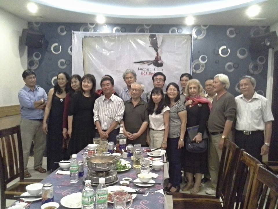 Tả hữu có nam có nữ Nhận diện dễ nhất là cô tóc vàng Sau lưng là đấng phu quân Hai bên vây cánh bạn Văn Thi Nhân Hội ngộ Tương Tri Nha Trang Nhìn vui hết biết hào sảng vô cùng! Những trái Tim say nóng bỏng Tình yêu văn nghệ Tấm Lòng CHÍ THÂN …Yêu nhiều tóc bạc đến trắng?Vẫn vui thơ thới lâng lâng tinh thần Chào đón các bạn Văn chương ”Chỉ tôi thiệt ngốc cứ Cùm cái Chân!”