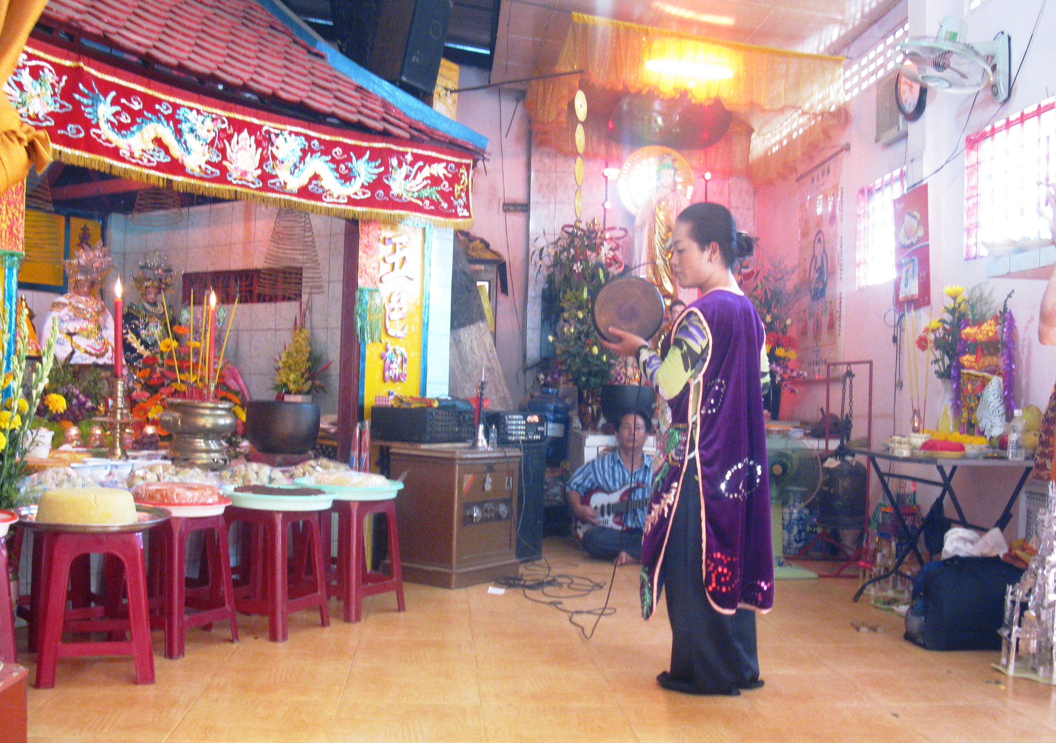 Đứng cạnh bàn thờ Bà là chị Bảy Thi, tuổi khoảng trên dưới 50, đang vừa gõ trống lịnh vừa hát, tụng Chầu mời, tức phần mở đầu một buổi tế đúng bài bản. Ngồi gần đó là ông Ba Lựa, tuổi phải trên 60, vốn là nhạc sĩ cổ nhạc, đã từng theo gánh hát và chơi trên đài phát thanh. Sát bên là chú Hai Xiêm trung niên, đang thủ cây ghi-ta điện 6 dây phím lõm để hòa theo tiếng đàn cò của ông Ba.