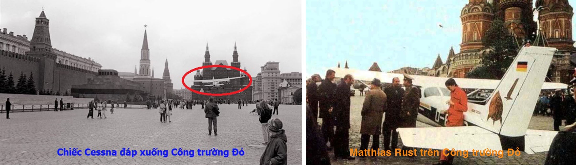 Rust, một thanh niên Tây Đức 19 tuổi, thuê chiếc máy bay dân dụng Cessna 172-B tại Hamburg và bắt đầu chuyến phi hành đến các nước Bắc Âu. Khởi hành đúng vào ngày 13/5/1987, Rust bay đến Na Uy, Phần Lan, Băng đảo, rồi Helsinki. Mỗi nơi Rust rong chơi đôi ngày. Chặng đường cuối, Rust cất cánh lúc 12:21 giờ trưa ngày 28/5 từ Helsinki và bay thẳng đến Moscow. Đúng ra, Rust báo cho đài kiểm không sẽ bay đến Stockholm, nhưng mới bay khoảng 20 phút, Rust quay ngược chiều bay về hướng Moscow. Vừa vượt qua không phận Estonia ở độ cao 1800 bộ, hệ thống radar của quân đội Liên sô phát hiện ngay và cho chiếc phản lực MIG-23 phóng lên theo dõi. Phi công MIG-23 báo cho biết là chỉ máy bay dân sự hạng nhẹ, rồi để vuột (sic). Một luồng radar khác cũng bắt được tín hiệu chiếc Cessna, nhưng lại tưởng là khinh khí cầu dùng để thăm dò thời tiết. Khi một hệ thống phòng không khác phát hiện, các sĩ quan trực lại nghĩ dấu hiệu của một đàn chim, không chừng là bầy ngỗng. Khi cách thủ đô Moscow 20 phút đường bay, hàng rào phòng thủ cuối cùng bảo vệ thủ đô lại tắt ngóm, chỉ vì máy móc phải tắt để bảo trì. Cuối cùng, Rust hạ cánh an toàn xuống Công trường Đỏ nằm ngoài bức tường của điện Cẩm Linh. Chỗ Rust hạ cánh chỉ cách văn phòng làm việc của TBT Gorbachev chừng 300m.