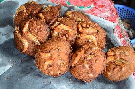 Có lẽ đây là hàng bánh cuối cùng và chủ sạp, một phụ nữ trẻ khuôn mặt ủ ê, đang gói mấy chiếc bánh bằng miếng lá chuối cho một người khách. Cạnh đó, một cái chảo đầy dầu chiên đang sôi sùng sục bắc trên một cái lò đun bằng củi. Một thau bột vẫn còn lưng lửng, bên kia là một cái thúng to đựng lủng củng đủ thứ: giá sống, gan heo, tôm sống.….Cái quạt trên tay cô nàng làm việc liên tục, nhưng vẫn không xua nổi đám ruồi nhặng lì lợm, cứ chờ chực lao vào. Giả tảng như không biết gì, tôi hỏi: _ Đây chợ Giồng phải không em?