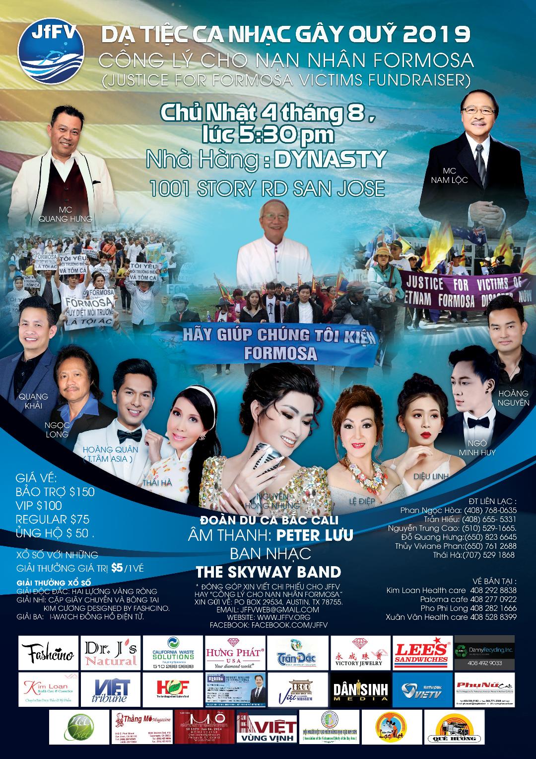 Nhằm mục đích giúp đỡ nạn nhân Miền Trung Việt Nam, gồm bốn tỉnh Hà-tĩnh, Quảng-bình, Quảng-trị, và Thừa thiên-Huế, khiếu kiện công ty Formosa trước tòa án quốc tế; đòi hỏi được đền bù xứng đáng và làm sạch vùng biển bị ô nhiễm, một số hội đoàn với sự cố vấn của các quý vị lãnh đạo Công giáo, Phật giáo, Cao Đài và Phật Giáo Hòa Hảo sẽ đứng ra tổ chức một bữa tiệc gây quỹ “Công Lý Cho Nạn Nhân Formosa” (Justice for Formosa Victims, JFFV);